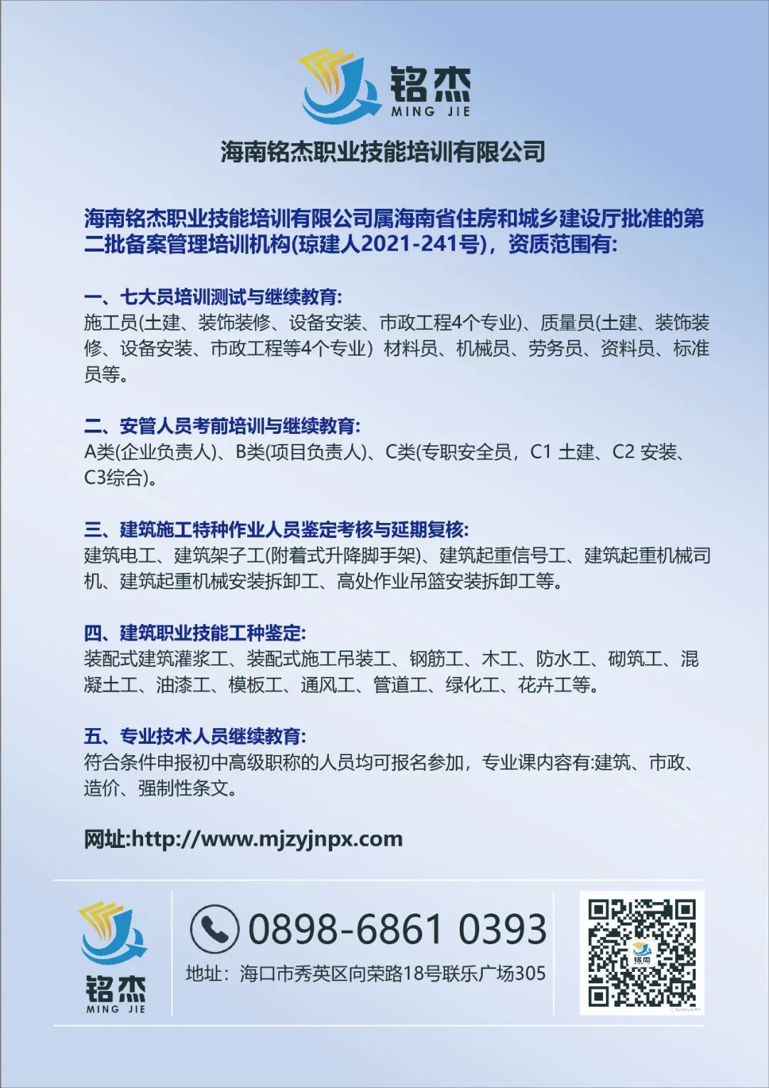 海南铭杰职业技能培训有限公司设立于2021年5月8日,属海南省住房和城乡建设厅批文公布的第二批告知性承诺备案培训机构,是建设行业专业技术人员教育培训基地、建...